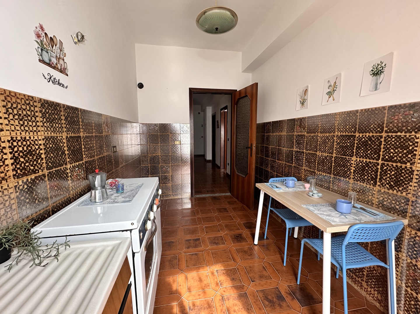 ampio disimpegno d’ingresso, comodo ripostiglio, spazioso e luminoso soggiorno, pratico cucinino, due camere da letto matrimoniali e due bagni, di cui uno con doccia e uno con vasca.