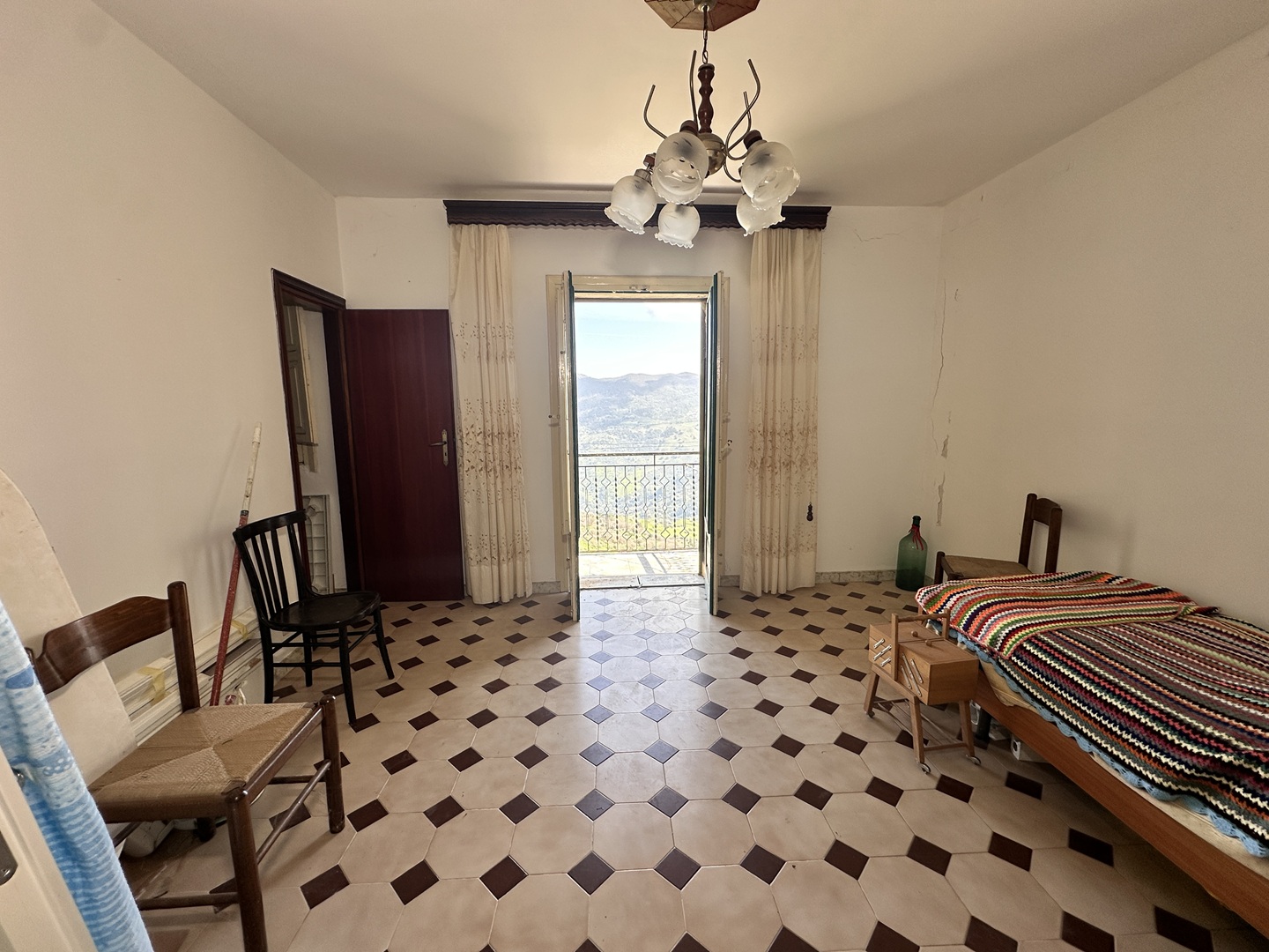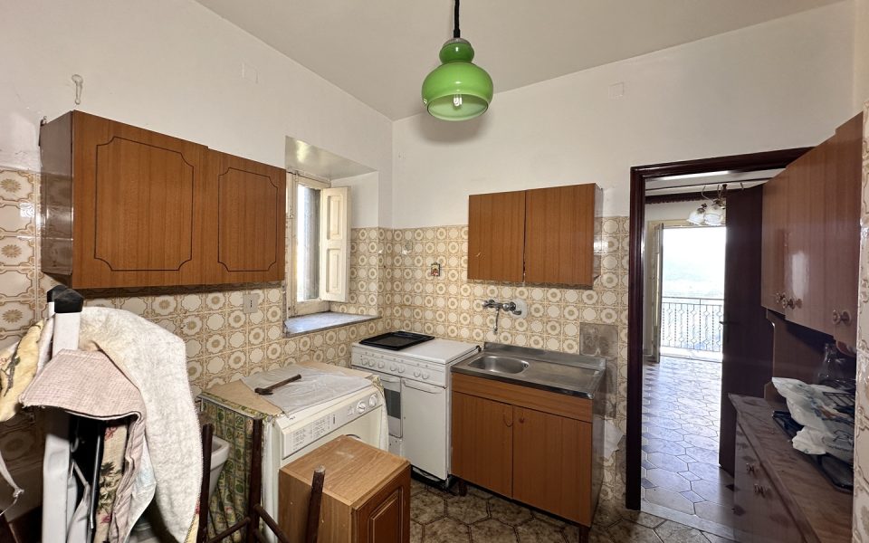 Una scala interna conduce al primo livello, accessibile anche tramite secondo ingresso indipendente. Qui troviamo un ampio disimpegno, un salone con balcone panoramico, una grande e luminosa camera padronale con balcone con vista sul borgo e un piccolo bagno.
